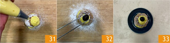 Adicione um pouco de creme também no topo 31 e decore com uma cereja em calda 32. A primeira zeppola está pronta 33, continue assim para todas as outras e coloque na geladeira até a hora de servir.