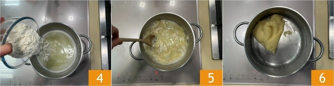 Assim que começar a ferver e a manteiga estiver completamente derretida, adicione a farinha de uma vez 4 e misture com uma colher de pau 5. Cozinhe até que a massa se solte das laterais da panela e forme uma camada esbranquiçada no fundo 6.
