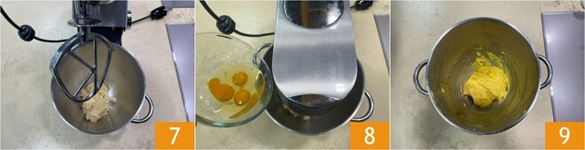 Despeje a mistura na tigela de uma batedeira equipada com pá 7 e ligue-a em velocidade baixa. Adicione os ovos um de cada vez 8, esperando que o primeiro esteja bem incorporado antes de adicionar o próximo. Você deve obter uma massa lisa e cremosa 9. Transfira-a para um saco de confeitar com bico estrela de 12 mm.