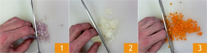 Para preparar os ziti ao forno em branco, comece pelo ragù: limpe e pique finamente a echalota 1 e a cebola 2, depois faça uma brunoise da cenoura 3.