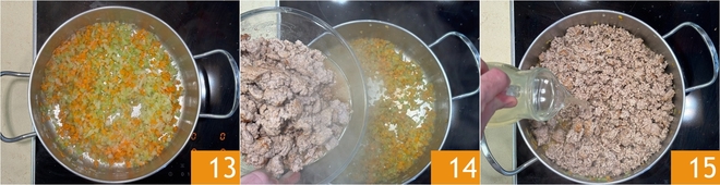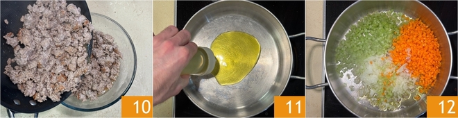 Junte as duas carnes moídas douradas 10 e reserve. Em uma panela, aqueça um pouco de azeite extravirgem 11, adicione a echalota, a cebola, o aipo e a cenoura 12 e deixe dourar em fogo médio-alto com uma pitada de sal.