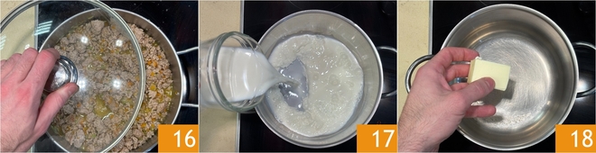 Cubra com a tampa 16 e cozinhe em fogo baixo por cerca de uma hora e meia, até que o ragù esteja macio e bem ligado. Enquanto isso, prepare o molho bechamel: aqueça o leite em uma panela 17, enquanto em outra panela derreta a manteiga 18.