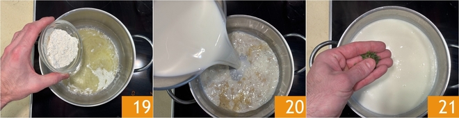Adicione a farinha 19 e misture. Despeje o leite quente aos poucos, mexendo com um batedor 20, continue cozinhando em fogo baixo até ferver, mexendo continuamente 21. Quando o molho bechamel estiver denso e cremoso 21, tempere com o tomilho, retire do fogo e cubra com filme plástico em contato.
