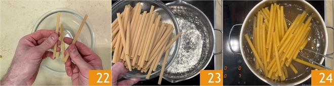 Passe então para a massa: quebre os ziti ao meio 22 e cozinhe em água fervente salgada por cerca de 5 minutos 23, depois escorra 24.
