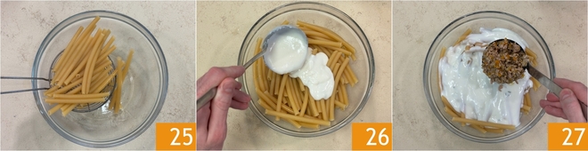 Transfira a massa para uma tigela grande 25. Adicione um terço do molho bechamel 26 e um terço do ragù 27.
