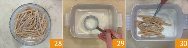 Misture bem para distribuir o tempero 28. Pegue agora uma assadeira de 20x28 cm: espalhe uma camada de molho bechamel no fundo 29 e disponha os ziti de maneira horizontal, alinhando-os ordenadamente 30.