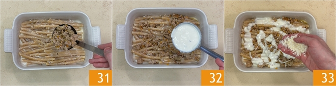 Cubra com mais ragù 31, algumas colheres de molho bechamel 32 e uma pitada de Parmigiano Reggiano ralado 33.