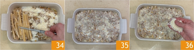 Disponha então a segunda e última camada de massa, desta vez na vertical 34, e complete com o ragù restante e quase todo o molho bechamel restante 35. Polvilhe generosamente a superfície com Parmigiano Reggiano ralado 36.