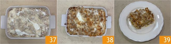 Distribua na superfície o molho bechamel reservado 37 e leve ao forno estático pré-aquecido a 170°C por 15 minutos, depois continue assando por 10 minutos a 230°C em modo estático. Quando a superfície estiver dourada e ligeiramente crocante 38, retire do forno e deixe esfriar um pouco seus ziti ao forno em branco antes de servi-los 39!