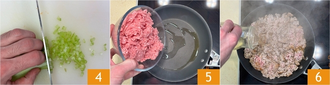 Faça o mesmo com o aipo 4 e reserve os vegetais picados. Aqueça um fio de azeite em uma frigideira antiaderente e doure a carne de vitela por alguns minutos 5, regando com metade do vinho branco 6.