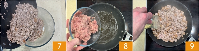 Transfira para uma tigela 7 e proceda da mesma forma com a carne de porco 8, regando com o vinho restante 9.