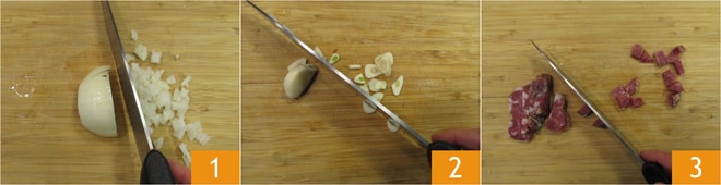 Para preparar os ziti ao forno, descasque e pique a cebola 1, faça o mesmo com os dentes de alho 2 e corte o salame em cubos 3.