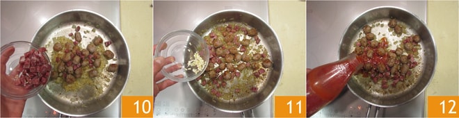 Adicione também o salame 10 e o alho picado 11. Em seguida, despeje o molho 12, alongando-o com um pouco de água, o suficiente para enxaguar a jarra. Tempere com pimenta e sal com moderação, pois o salame dará sabor ao molho.