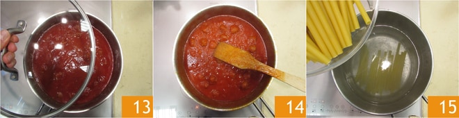 Cubra com a tampa e cozinhe o molho por cerca de 30 minutos 13. Uma vez cozido, reserve 14. Cozinhe os ziti quebrados em água fervente com sal, eles devem estar bem al dente 15.