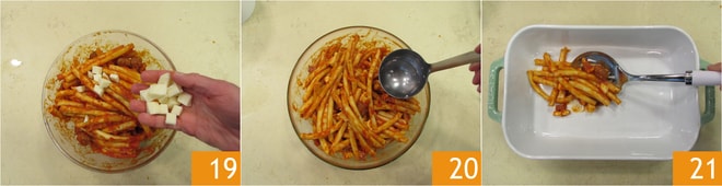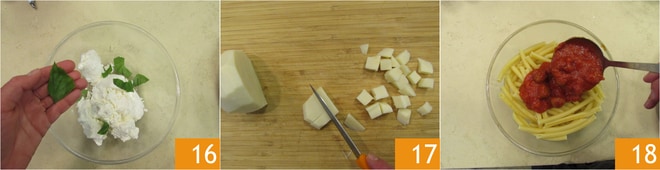 Misture a ricota com manjericão, sal, pimenta e óleo 16. Corte a provola e a muçarela em cubos 17. Escorra os ziti em uma tigela, reservando a água de cozimento, e despeje o molho 18.