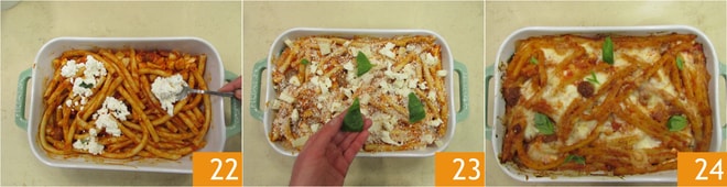 Tempere com parmesão e algumas colheradas de ricota espalhadas 22. Continue com mais massa, depois mais ricota, queijo ralado, muçarela e folhas de manjericão 23. Asse em forno estático pré-aquecido a 180°C por 20 minutos ou até dourar. Deixe repousar por 15-20 minutos antes de servir os ziti ao forno 24.