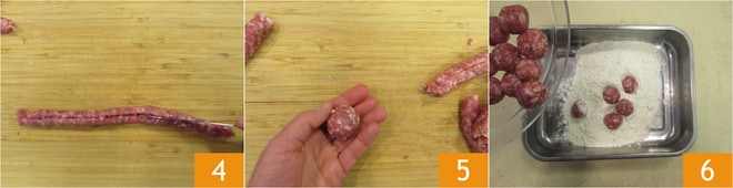 Faça um corte na linguiça 4, retire a pele e forme pequenas almôndegas com a carne 5. Passe as almôndegas na farinha 6.