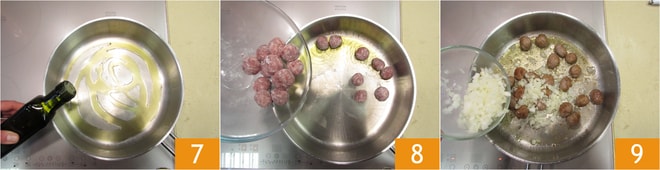 Aqueça uma quantidade generosa de óleo na frigideira 7 e doure as almôndegas 8, depois adicione a cebola 9.