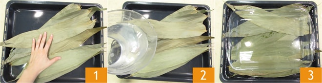 Para preparar os zongzi, primeiro coloque as folhas de bambu em um recipiente grande o suficiente 1, cubra-as com água 2 e coloque um peso por cima para que fiquem submersas 3. Deixe de molho por 12 horas.