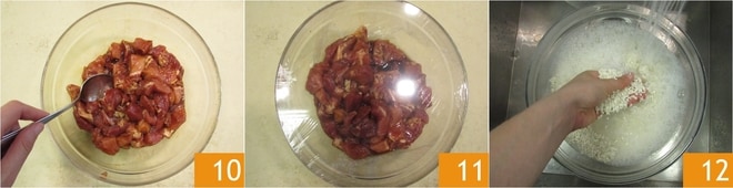Misture bem 10, cubra com filme plástico 11 e deixe marinar por 2 horas. Enquanto isso, enxágue o arroz em água corrente 2-3 vezes 12.