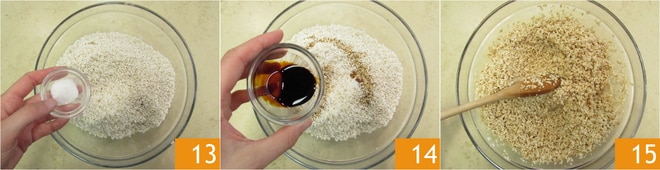 Coloque o arroz em uma tigela e tempere com sal 13, molho de soja escuro e claro 14. Misture bem e reserve 15.