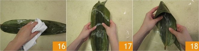Após o tempo de molho, pegue as folhas de bambu e enxágue-as em água corrente, depois limpe-as com um pano de ambos os lados para remover as impurezas 16. Sobreponha ligeiramente 2 folhas 17, depois dobre-as para formar uma espécie de cone aberto de um lado 18.