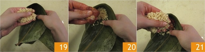 Mantenha o cone assim formado na palma da mão e insira uma pequena quantidade de arroz 19, depois adicione 2 ou 3 pedaços de carne 20 e cubra com mais arroz 21; o arroz na base deve ser cerca de um terço em relação ao recheio total de cada zongzi.