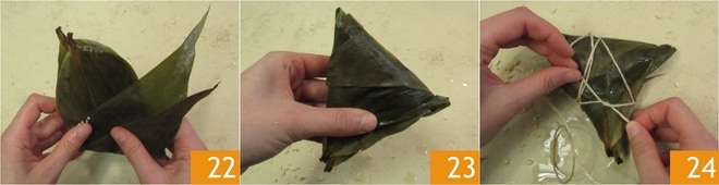 Dobre as extremidades das folhas 22 para obter uma forma de triângulo 23 e feche enrolando o pacotinho com várias voltas de barbante de cozinha 24. Proceda da mesma forma até acabar os ingredientes, com essas quantidades você obterá 20 peças. Para conveniência, você pode amarrar juntas as extremidades do barbante de 4-5 zongzi para que seja mais fácil escorrer.