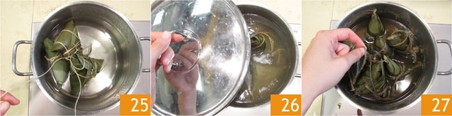 Coloque os zongzi em uma panela grande cheia de bastante água 25, cubra com a tampa e leve para ferver em fogo alto. Quando a água começar a ferver, reduza o fogo ao mínimo e continue cozinhando por 2 horas 26. Após o tempo de cozimento, retire os zongzi da água 27.
