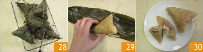 Retire o barbante 28 e abra delicadamente as folhas de bambu 29. Seus zongzi estão prontos para serem saboreados 30!
