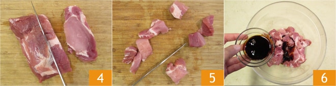 Corte a carne em fatias com cerca de 2 cm de espessura 4 e faça cubinhos 5. Transfira-os para uma tigela e tempere com o molho de soja claro e escuro 6.
