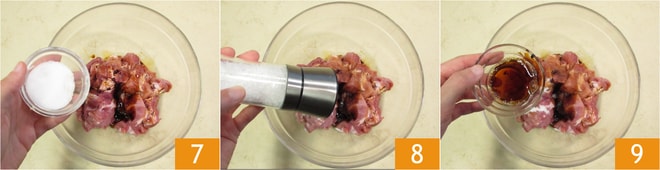 Adicione também o açúcar 7, o sal 8, a pimenta e o vinho de arroz 9.