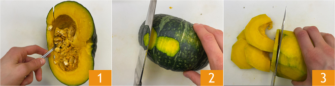 Para preparar a abóbora em saor, primeiro prepare o Caldo de legumes, seguindo nossa receita, e mantenha-o aquecido. Corte a abóbora ao meio, remova as sementes e os filamentos internos 1, depois retire a casca 2 e corte a polpa em fatias 3.