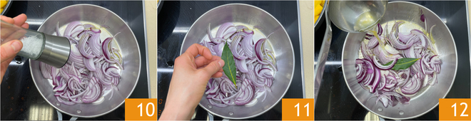 Adicione o sal 10, o louro 11 e uma concha de caldo de legumes 12. Deixe refogar em fogo médio-baixo por cerca de 15 minutos.