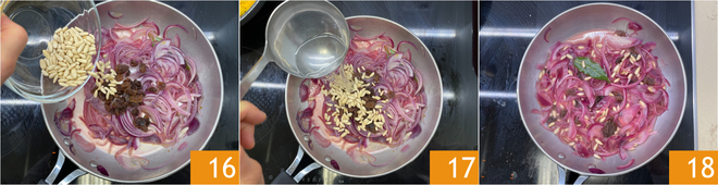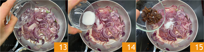 Neste ponto, adicione o vinagre 13, o açúcar 14 e as uvas-passas 15.
