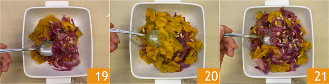 Neste ponto, transfira tanto a abóbora quanto a cebola para uma travessa, alternando as camadas 19 20 21. Coloque na geladeira e deixe descansar de 6 a 12 horas, para que os sabores se misturem bem.