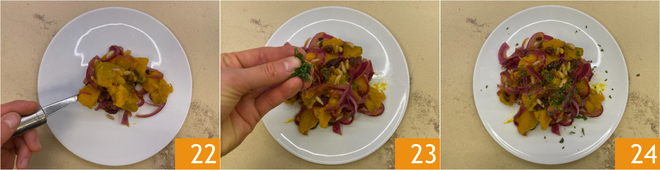 Após o tempo de repouso, sirva 22 e complete com salsinha picada 23. Sua abóbora em saor está pronta para ser saboreada 24!