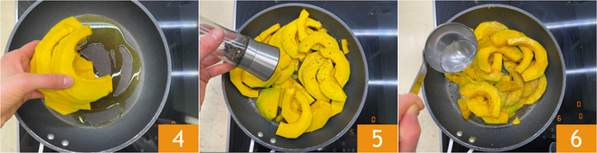 Em uma frigideira, aqueça um fio de azeite, em seguida adicione a abóbora 4 e tempere com sal e pimenta 5. Cozinhe em fogo médio por 2 minutos, depois despeje um concha de caldo de legumes na frigideira 6.