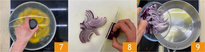 Cubra com uma tampa 7 e continue cozinhando em fogo médio-baixo por cerca de 10 minutos. Enquanto isso, limpe e corte finamente a cebola 8. Em outra frigideira, despeje um fio de azeite junto com as cebolas 9.