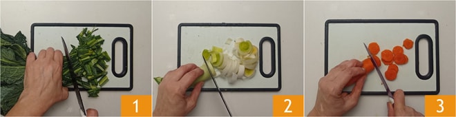 Para preparar a sopa de couve negra, primeiro limpe a couve negra e corte as folhas em pedaços 1. Elimine a parte mais verde do alho-poró e a primeira camada, depois corte-o em rodelas de 1 cm de espessura 2. Descasque e corte a cenoura em rodelas de 1 cm de espessura 3.