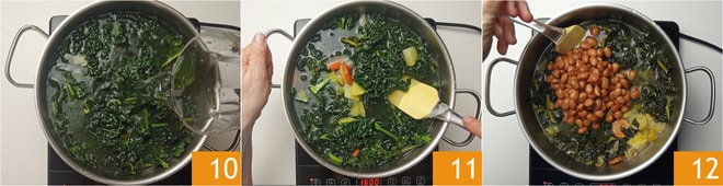 Cubra com água 10, ajuste o sal e continue a cozinhar em fogo baixo por 30 minutos, mexendo de vez em quando 11. Quando faltarem 10 minutos para o final do cozimento, adicione também os feijões borlotti, bem escorridos do seu líquido de conservação 12, e termine o cozimento. Sirva e complete com um fio de azeite cru. Sua sopa de couve negra está pronta para ser servida, talvez acompanhada de croutons ou pão torrado!