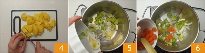 Descasque as batatas e corte-as em cubos de cerca de 3 cm 4. Em uma panela, despeje o azeite, adicione o alho-poró 5 e refogue por um minuto. Adicione as cenouras 6 e continue cozinhando por um minuto.
