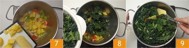 Adicione as batatas 7 e deixe cozinhar por 5 minutos em fogo baixo. Finalmente, adicione a couve negra 8 e misture tudo 9.