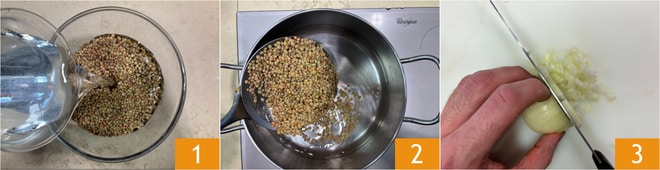 Para preparar a sopa de espelta e lentilhas, primeiro coloque as lentilhas de molho em água fria 1 por 2 horas. Escorra, coloque em uma panela com água fria salgada 2 e cozinhe por 30 minutos. Escorra novamente e reserve tanto as lentilhas quanto a água de cozimento. Pique finamente a cebola 3.
