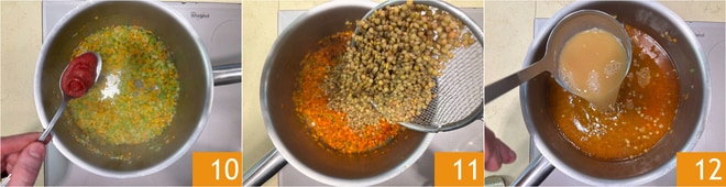 Adicione o extrato de tomate 10 e as lentilhas 11. Cubra com a água de cozimento das lentilhas 12.