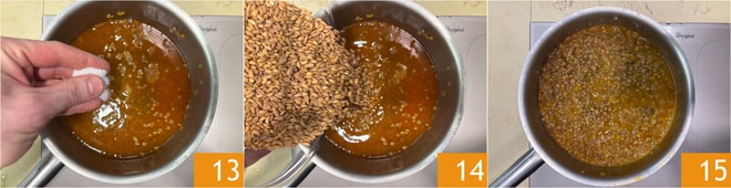 Ajuste o sal 13. Adicione a espelta 14 e cozinhe por 30 minutos 15. Se necessário, adicione mais água de cozimento das lentilhas.