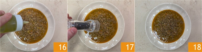 Sirva e complete com um fio de azeite 16 e uma pitada de pimenta 17. A sopa de espelta e lentilhas está pronta para ser saboreada 18.