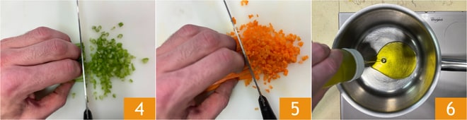 Faça o mesmo com o aipo 4 e a cenoura 5. Na mesma panela em que cozinhou as lentilhas, adicione o óleo 6.