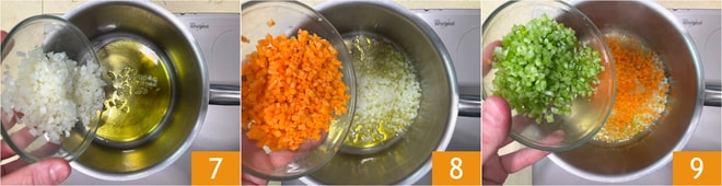 Adicione a cebola 7, a cenoura 8 e o aipo 9. Refogue por alguns minutos.