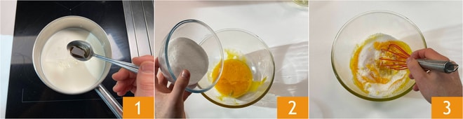 Para preparar a zuppa inglese de colomba, a primeira coisa é fazer o creme de confeiteiro: despeje o leite em uma panela junto com o extrato de baunilha 1 e leve para ferver. Enquanto isso, coloque as gemas em uma tigela, bata levemente e adicione o açúcar 2. Misture bem com um batedor 3.